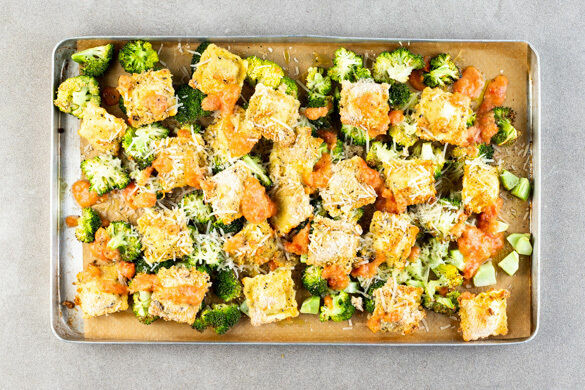 Den Brokkoli und die Ravioli auf zwei mit Backpapier ausgelegten Backblechen verteilen. Jeweils mit 1–2TL Olivenöl beträufeln, mit je 1 Prise Salz und Pfeffer würzen und 12–15Min. im Ofen backen, bis der Brokkoli gar ist und die Ravioli goldbraun und knusprig sind. Je nach Ofen die Position der Bleche nach der Hälfte der Zeit tauschen.