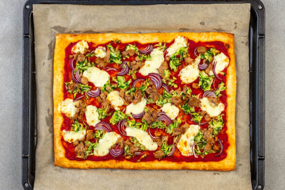 Thunfischpizza aus der Tiefkühltruhe sieht oft etwas unspektakulär aus – da hat unser Rezept deutlich mehr zu bieten: zartgrüne Zucchini, rot-violette Zwiebelringe und goldgelbe Mozzarellastücke … Klar, der Thunfisch ist immer noch mit von der Partie, aber er ist eben vielmehr geschmacklich als optisch ein Star. Bei so viel Farbenpracht ist der Appetit bestimmt besonders groß – na dann mal ran ans Blech!