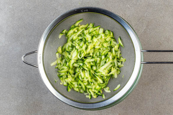 Den Backofen auf 250°C (230°C Umluft) vorheizen. 1 Knoblauchzehe schälen und fein würfeln oder durch eine Knoblauchpresse drücken. Die Zucchini grob raspeln, mit 1TL Salz und dem Knoblauch vermischen und in ein Sieb geben.
