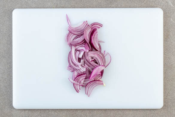 Die ½ der Zwiebel schälen und in feine Streifen schneiden. Die übrige Hälfte wird für dieses Rezept nicht benötigt.