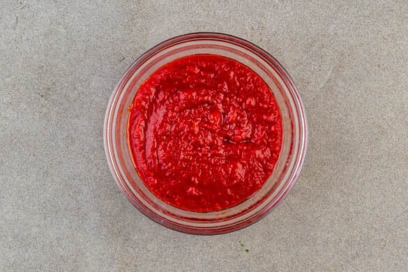 Die übrige Knoblauchzehe schälen und fein würfeln, mit dem Tomatenmark, 2EL Olivenöl, 1TL Essig und 2EL Wasser zu einer Sauce verrühren und mit Salz und Pfeffer würzen.