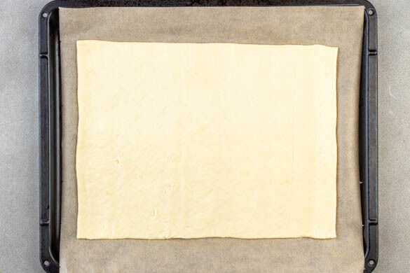 Den Teig mit dem Papier nach unten auf einem Backblech ausrollen und vorsichtig flach drücken, bis er die gesamte Größe des Blechs einnimmt.