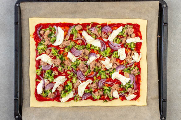 Den Thunfisch abgießen und mit einer Gabel zerkrümeln. Die Tomatensauce gleichmäßig auf dem Teig verstreichen, dabei einen Rand von ca. 1cm frei lassen. Die Zucchini ausdrücken, um überschüssiges Wasser zu entfernen, und mit dem Thunfisch und den Zwiebeln auf der Pizza verteilen. Den Mozzarella grob zerpflücken und auf die Pizza legen, mit 1 Prise Salz würzen.