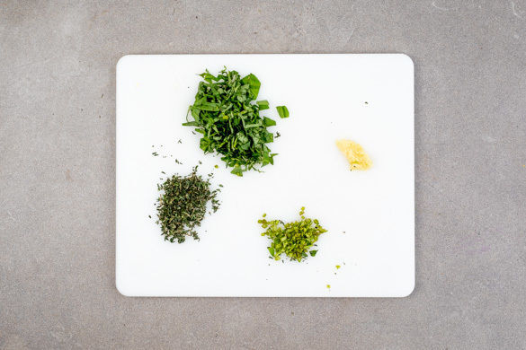 Die Thymianblättchen von den Stängeln streifen und fein schneiden. Die Basilikumblätter von den Stängeln zupfen und die Stängel und Blätter getrennt voneinander fein schneiden. Den Knoblauch schälen und fein würfeln.