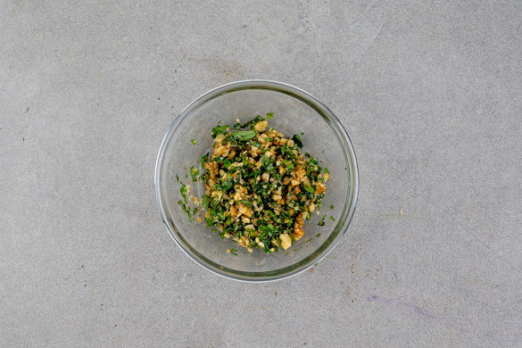 Die Walnüsse fein hacken und mit ca. ⅔ der Basilikumblätter, 1EL Olivenöl sowie je 1 Prise Salz und Pfeffer vermengen.