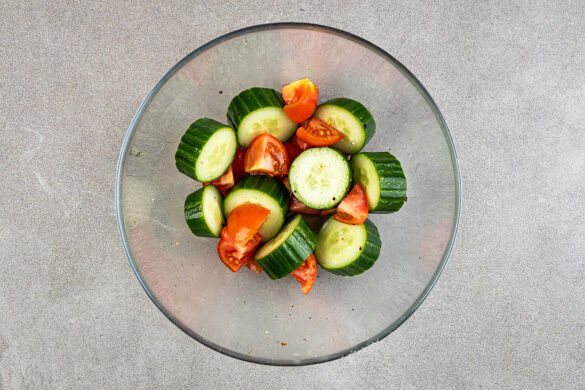 Die Gurke in große, ca. 2cm dicke Scheiben schneiden. Die Tomate in ca. 2cm große Stücke schneiden. Die Limette halbieren und auspressen. Den Limettensaft mit 1EL Pflanzenöl und je 1 Prise Salz, Pfeffer und Zucker zu einem Dressing verrühren und mit den Gurken und den Tomaten vermengen.