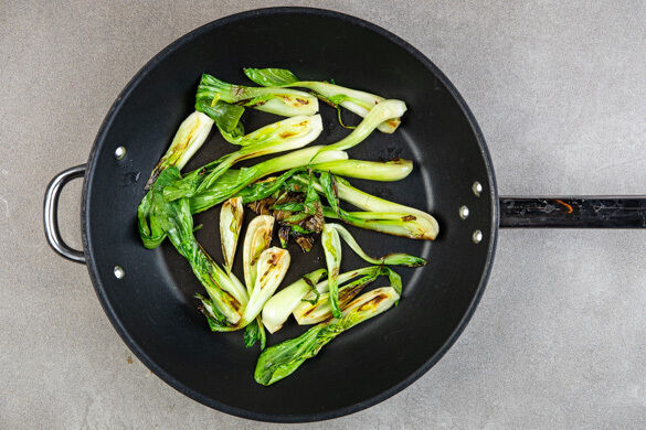 Den Pak Choi der Länge nach vierteln. In einer großen Pfanne mit 1TL Pflanzenöl bei mittlerer Hitze mit der Schnittfläche nach unten 1–2Min. anbraten, wenden und weitere 1–2Min. braten, bis der Pak Choi etwas weicher wird, aber noch bissfest ist. Aus der Pfanne nehmen, die Pfanne mit Küchenkrepp auswischen und weiterverwenden.