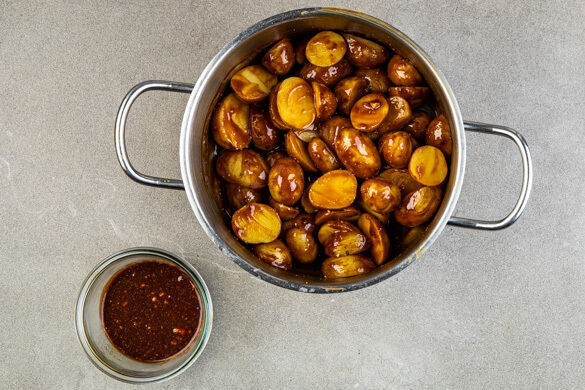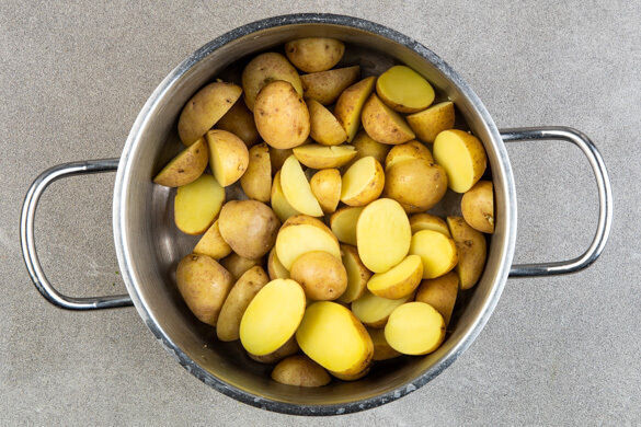 In einem mittelgroßen Topf ausreichend gesalzenes Wasser für die Kartoffeln zum Kochen bringen. Die Kartoffeln samt Schale je nach Größe halbieren oder vierteln und im kochenden Wasser in 8–10Min. weich, aber noch bissfest kochen. Die Kartoffeln in ein Sieb abgießen und zurück in den Topf geben.