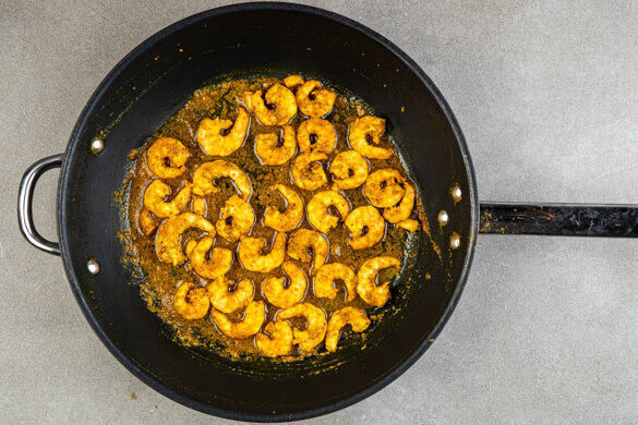 Die Garnelen in einem Sieb kalt abspülen und abtropfen lassen, dann trocken tupfen. Die Garnelen in der Pfanne mit 1EL Pflanzenöl bei mittlerer bis starker Hitze ca. 2Min. braten, bis sie gar sind. Während der Garzeit mit dem Currypulver und 1 kräftigen Prise Salz würzen.