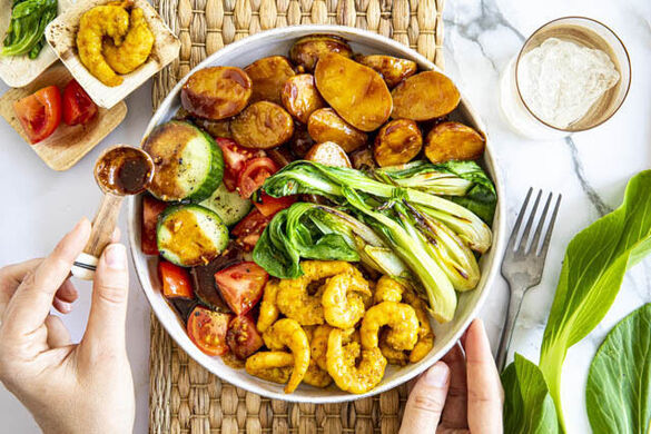 Die Kartoffeln, den Gurken-Tomaten-Salat, den Pak Choi und die Garnelen in Schüsseln anrichten, den Pak Choi mit dem Sesamöl beträufeln und die Garnelen-Bowls nach Belieben mit der restlichen Erdnusssauce garniert servieren.