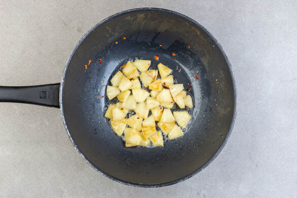 Die ½ der Ananas in einem Sieb abtropfen lassen, dabei den Saft auffangen. Die abgetropften Ananasstücke mit der Chili und 1 Prise Salz in einem Wok oder einer großen Pfanne mit 1TL Pflanzenöl bei mittlerer bis starker Hitze ca. 2Min. anbraten, bis leichte Röstspuren zu sehen sind. Dann aus der Pfanne nehmen und beiseitestellen.