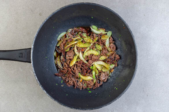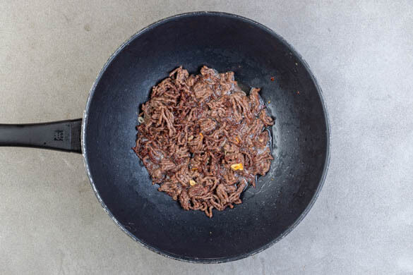 Das Hackfleisch im Wok bzw. der Pfanne mit 1EL Pflanzenöl bei starker Hitze 3–4Min. scharf anbraten. Den Knoblauch in den letzten 1–2Min. zugeben und mitbraten.