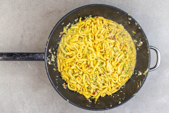 600g Spätzle hinzugeben und 3–4Min. mitbraten, dann mit 300ml Milch ablöschen und ca. 1Min. leicht einköcheln lassen. Die Basilikumcreme unterrühren und mit Salz und Pfeffer abschmecken.