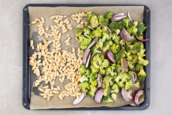 Den Backofen auf 220°C (200°C Umluft) vorheizen. Den Brokkoli in ca. 2cm große Röschen schneiden. Die Zwiebel schälen und halbieren, eine Hälfte in ca. 1cm breite Spalten schneiden. Die übrige Hälfte fein würfeln.