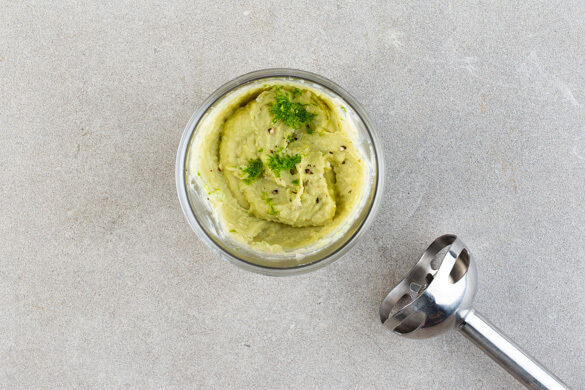 Die gebackenen Bohnen mit dem Knoblauch, dem restlichen Limettensaft, der restlichen Limettenschale nach Geschmack und der Guacamole in einem hohen Gefäß cremig pürieren. Mit Salz und Pfeffer abschmecken.