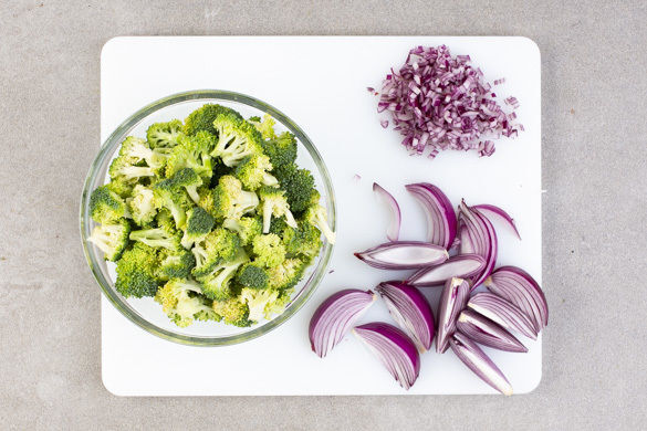 Den Backofen auf 220°C (200°C Umluft) vorheizen. Den Brokkoli in ca. 2cm große Röschen schneiden. Die Zwiebeln schälen und halbieren, 3 Hälften in ca. 1cm breite Spalten schneiden. Die übrige Hälfte fein würfeln.