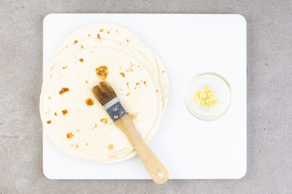 Die Tortillas von beiden Seiten mit insgesamt 2EL Olivenöl dünn bepinseln und im Ofen in 1–2Min. erwärmen. Währenddessen den Knoblauch schälen und sehr fein würfeln oder durch eine Knoblauchpresse drücken.