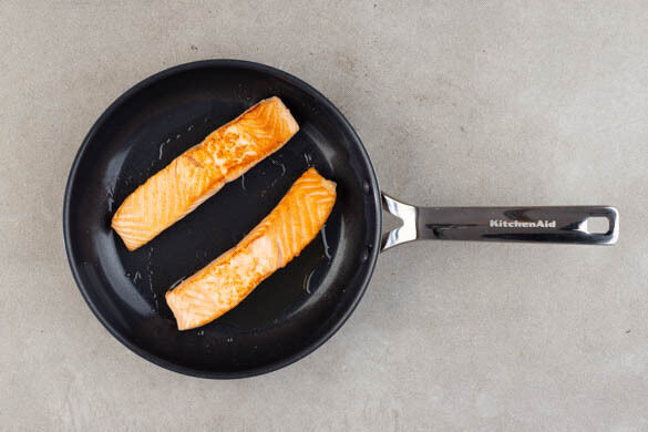 Den Fisch mit kaltem Wasser abspülen, trocken tupfen und evtl. vorhandene Gräten und Schuppen entfernen. 1EL Olivenöl bei mittlerer bis starker Hitze in der Pfanne erwärmen, dann den Fisch mit der Hautseite nach unten hineingeben und 3–5Min. braten. Vorsichtig wenden und 1–2Min. weiterbraten.