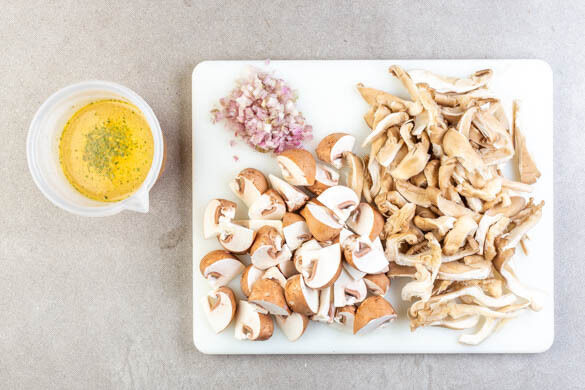Die Schalotte schälen, halbieren und fein würfeln. Die Austernpilze grob in Streifen schneiden. Die Champignons je nach Größe vierteln oder achteln. Die ½ des Brühgewürzes in 550ml heißem Wasser auflösen.