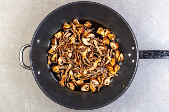 In derselben Pfanne die Champignons mit 2TL Olivenöl bei mittlerer bis starker Hitze 4–5Min. braten, bis sie gebräunt sind und die meiste Feuchtigkeit verdunstet ist. Vom Herd nehmen und die Austernpilze unterrühren. Mit je 1 kräftigen Prise Salz und Pfeffer würzen und bis zum Servieren warmhalten.