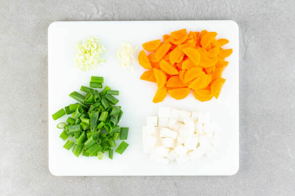 In einem kleinen Topf ausreichend Wasser für die Eier zum Kochen bringen. Die Karotten schälen, längs halbieren und schräg in dünne Scheiben schneiden. Den Rettich schälen und in ca. 1,5cm große Würfel schneiden. Den weißen Teil der Lauchzwiebeln fein würfeln, den grünen Teil in ca. 1cm breite Ringe schneiden. Den Knoblauch schälen und fein würfeln.