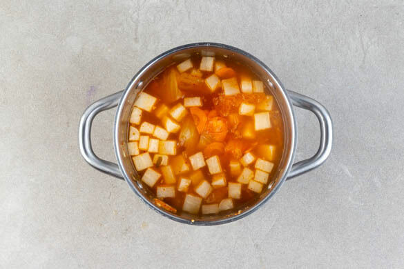 In einem Wasserkocher 1,5L Wasser aufkochen. Das Kimchi samt Flüssigkeit, die weißen Lauchzwiebeln und den Knoblauch in einem großen Topf mit 2EL Pflanzenöl bei mittlerer Hitze 2–3Min. anbraten. Die Karotten und den Rettich zugeben und 2Min. mitbraten. Mit Salz und Pfeffer würzen.