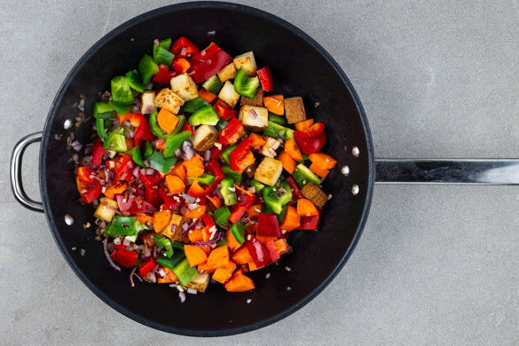 Die Zwiebeln und den Tofu in einer mittelgroßen Pfanne mit 2EL Olivenöl bei starker Hitze 2–3Min. goldbraun anbraten. Die Paprika, die Karotten und den Knoblauch hinzugeben und 3–4Min. mitbraten.