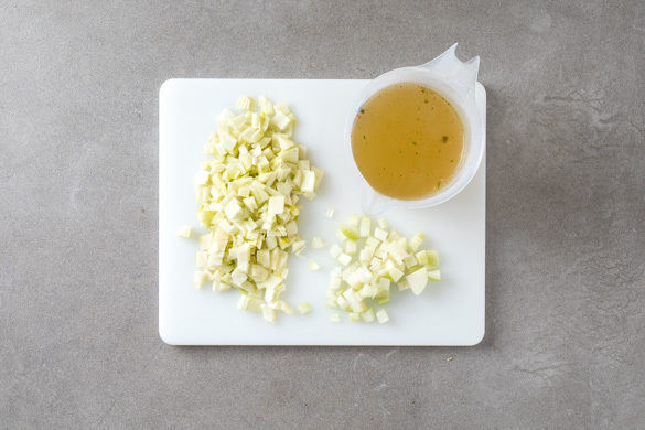 Den Backofen auf 240°C (220°C Umluft) vorheizen. Das Brühgewürz in 750ml heißem Wasser auflösen. Den Blumenkohl in 2–3cm große Röschen schneiden. Den Fenchel halbieren, Strunk und Stiele entfernen, dann grob würfeln. Die Zwiebel schälen, halbieren und ebenfalls grob würfeln.
