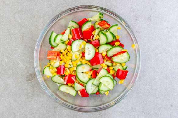 Die Gurke, die Paprika und den restlichen Mais mit 3EL Essig vermengen und den Salat mit Salz und Pfeffer abschmecken.