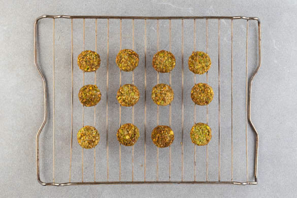 Die Falafeln halbieren, und auf einem Backrost 4–5Min. im Ofen erwärmen.
