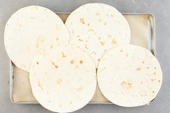 4 Tortillas auf einem mit Backpapier ausgelegten Backblech 2–3Min. im Ofen erwärmen. Tipp: Wer mag, kann die übrigen Tortillas in Stücke schneiden, mit Öl und Salz vermischen und bei 180°C in ca. 8Min. zu Tortillachips backen.
