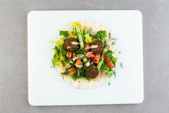 Die Tortillas mit je 1–2TL Tahinisauce bestreichen und nach Belieben mit den Falafeln, einigen Gurken, etw Salat und dem Tomatentopping belegen. Zu Wraps zusammenfalten. Die übrigen Gurken in mundgerechte Stücke schneiden, mit dem restlichen Salat, 1–2TL Zitronensaft, 1–2TL Olivenöl sowie je 1 Prise Salz und Pfeffer vermengen und als Beilage servieren.