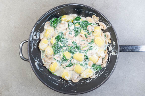 Die Gnocchi, den Spinat, den Knoblauch und die Crème fraîche zu den Pilzen geben, alles gut vermengen und mit je 1 Prise Salz und Pfeffer sowie 1EL Essig würzen. Nach Bedarf etwas Kochwasser untermengen.