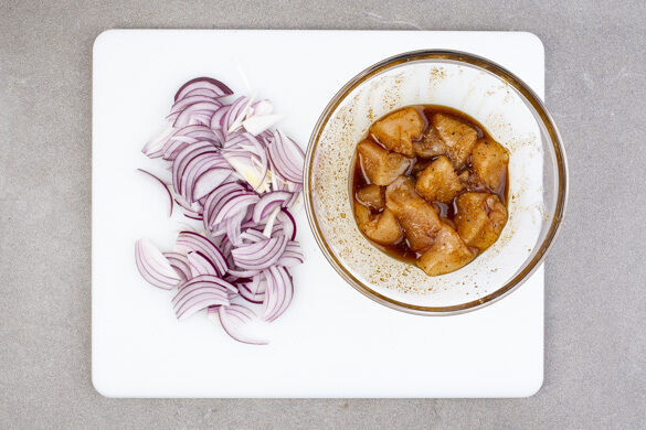 Das Fleisch trocken tupfen und mit 2EL Olivenöl, der Gewürzmischung sowie je 1 kräftigen Prise Salz und Pfeffer vermengen. Die Zwiebel schälen, halbieren und in feine Streifen schneiden.