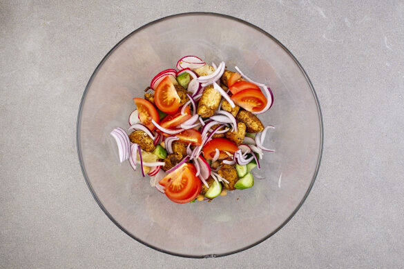 Die Kichererbsen ebenfalls abgießen, mit kaltem Wasser abspülen und abtropfen lassen. Die Tomaten in Spalten schneiden. Die Gurke längs halbieren, quer in dünne Scheiben schneiden und mit den Zwiebeln, der ½ der Ananas, den restlichen Radieschen und den Tomaten vermengen.