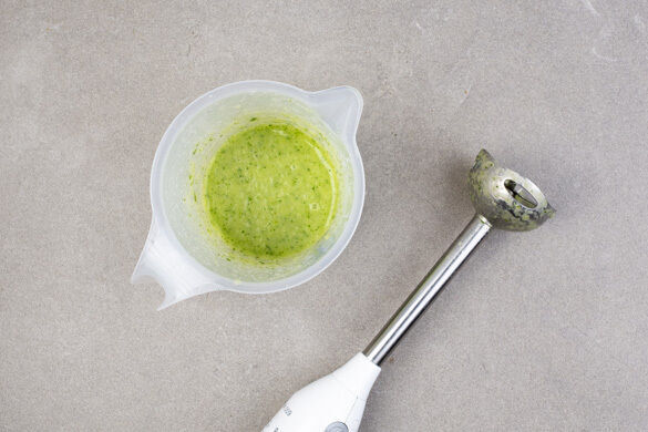 Inzwischen die Limettenschale abreiben, dann die Limette halbieren und auspressen. Die restliche abgetropfte Ananas mit ⅔ des Korianders, 1TL Limettenschale, 2EL Limettensaft, 1EL Olivenöl, ½EL Essig sowie je 1 Prise Salz und Pfeffer in einem hohen Gefäß zu einem cremigen Dressing pürieren. Ggf. etwas Wasser dazugeben, falls das Dressing zu dickflüssig ist.