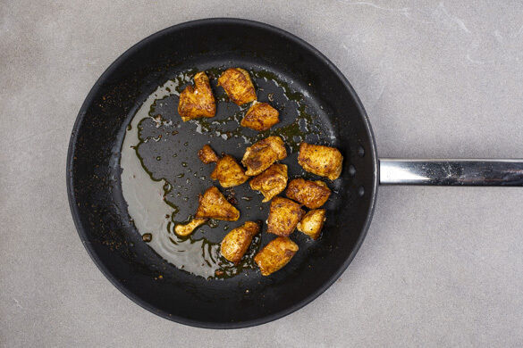 Das Fleisch in einer mittelgroßen Pfanne bei mittlerer Hitze in 7–9Min. rundum goldbraun und gar braten. Aus der Pfanne nehmen und auf einem Teller beiseitestellen.