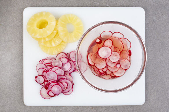 Die ½ der Ananas in einem Sieb abtropfen lassen, dabei 3EL Saft auffangen. Die übrige Ananas wird für dieses Rezept nicht benötigt. Die Radieschen in dünne Scheiben schneiden. Die ½ der Radieschen mit 1EL Ananassaft, 1EL hellem Essig und 1 Prise Salz vermengen.