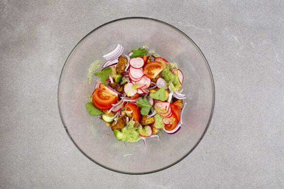 Die restlichen Korianderblätter abzupfen. Die eingelegten Radieschen abgießen und mit dem Koriander sowie ca. ⅓ des Dressings unter die Kichererbsen mengen. Den Salat mit Salz und Pfeffer abschmecken und mit dem Tandoori-Hähnchen anrichten. Mit dem restlichen Dressing garnieren und servieren.