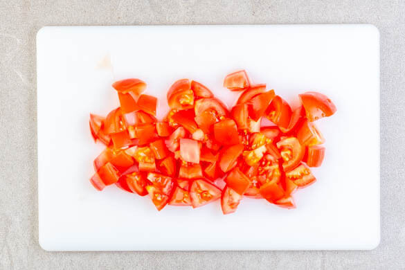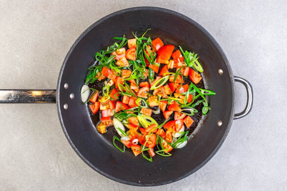 Ca. ¼ der Lauchzwiebeln für die Garnitur beiseitestellen. Die übrigen Lauchzwiebeln und die Tomaten in einer mittelgroßen Pfanne mit 1EL Pflanzenöl bei mittlerer Hitze ca. 1Min. braten.