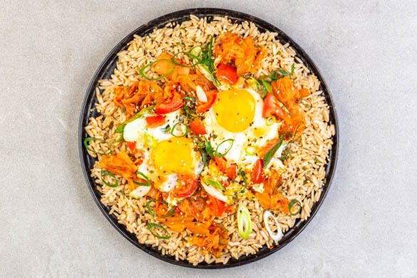 Schon mal auf der koreanischen Halbinsel gewesen? Nein? Das macht nichts. Mit diesem Rezept bist du in ca. 20Min. vor Ort. Und es wird scharf. Kimchi und Reis – hier als Parboiled-Naturreis – gehören grundsätzlich zu jeder koreanischen Mahlzeit dazu. Knackiges Gemüse und Spiegeleier sorgen für eine nahrhaft-bunte Mischung, und die Sojasauce gibt dem Ganzen den geschmacklichen Feinschliff. Mach dich auf die Reise!
