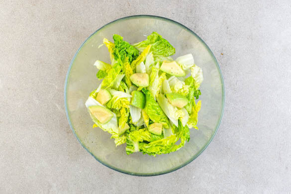4EL Olivenöl, 2EL Essig und je 1 kräftige Prise Salz und Pfeffer zu einer Vinaigrette verrühren. Den Salat vom Strunk befreien und in Streifen schneiden. Die Avocados halbieren, den Kern entfernen und das Fruchtfleisch in der Schale kreuzweise einschneiden. Die Avocadowürfel mit einem Löffel aus der Schale lösen und mit dem Salat und der Vinaigrette vermengen.
