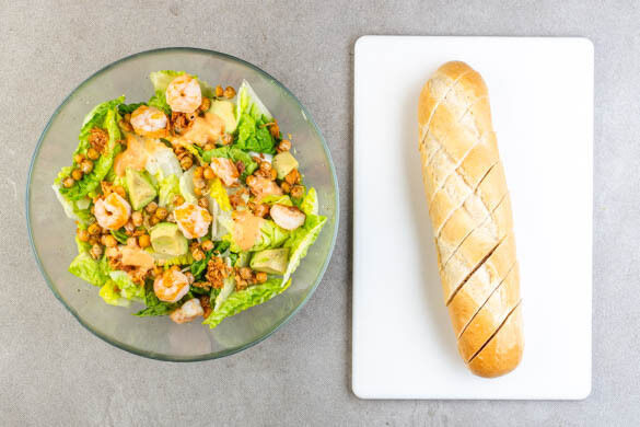 Es gibt kaum etwas, das so viel Freude macht, wie ein lecker erfrischender Salat: Saftig gebratene Garnelen treffen auf knackigen Romanasalat, cremige Avocado und eine selbstgemachte Cocktail-Sauce mit Limette, Sriracha und Sweet-Chili-Sauce. Knusprig geröstete Kichererbsen und Röstzwiebeln sorgen für extra Crunch. Dazu noch ein aufgebackenes Brötchen – fertig ist der Schmaus. Yum!