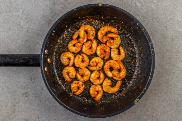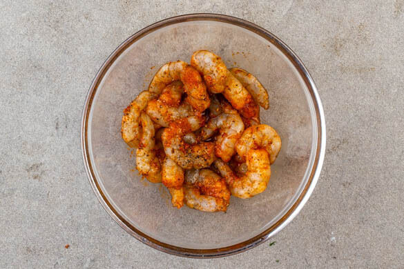 Die Garnelen in einem Sieb mit kaltem Wasser abspülen und mit etwas Küchenkrepp trocken tupfen. Mit 1EL Pflanzenöl, der Gewürzmischung sowie je 1 kräftigen Prise Salz und Pfeffer vermengen.