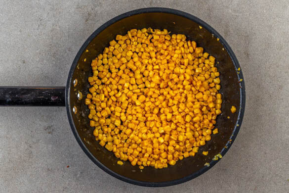 Den Mais in einem Sieb abtropfen lassen. 2EL Pflanzenöl in einer großen Pfanne bei starker Hitze erwärmen, dann den Mais mit 1 kräftigen Prise Salz zugeben und ohne Rühren ca. 4Min. anrösten, bis der Mais Röstmarken bekommt. Dann umrühren und weitere 2–4Min. anrösten, bis der Mais möglichst von allen Seiten Röstmarken hat. In einer Schüssel beiseitestellen. Die Pfanne aufbewahren.
