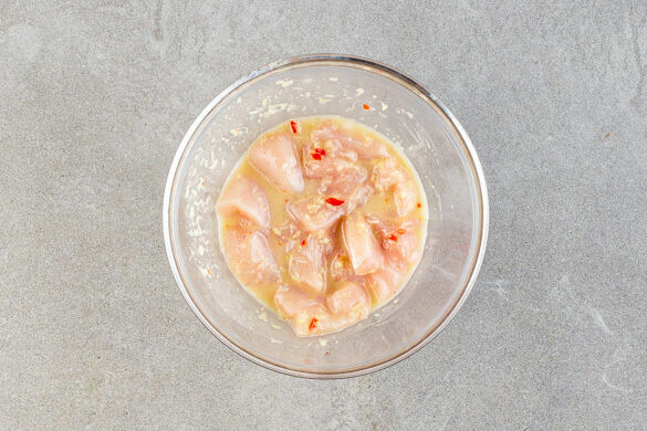 Die äußeren Blätter entfernen und die unteren 3cm des Zitronengrases fein hacken, das übrige Zitronengras aufbewahren. Den Knoblauch schälen und halbieren. Die Peperoni in Ringe schneiden und mit dem gehackten Zitronengras, dem Knoblauch, der Fischsauce, 3EL Pflanzenöl, 2EL Wasser und 1TL Zucker pürieren. Das Fleisch trocken tupfen, untermengen und beiseitestellen.