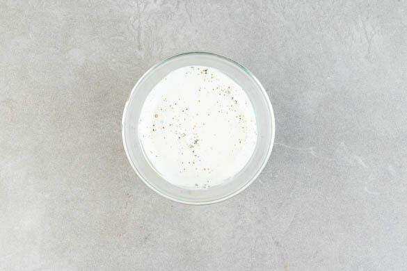Ca. 3/4 des Käses zerkrümeln und mit dem Joghurt verrühren. Mit Salz und Pfeffer abschmecken. Tipp: Wer mag, kann auch mehr Blauschimmelkäse verwenden.