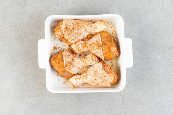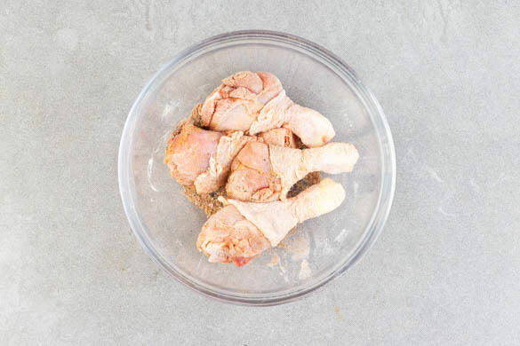 Den Backofen auf 220°C Umluft (240°C Ober-/Unterhitze) vorheizen. Die Gewürzmischung mit 1–2EL Mehl sowie je 1 kräftigen Prise Salz und Pfeffer verrühren. Die Drumsticks gut mit etwas Küchenkrepp trocken tupfen, dann rundum mit 2EL Pflanzenöl einreiben und in der Mehlmischung wenden. Übrige Mehlmischung aufbewahren.