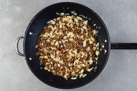 In einem Wasserkocher 600ml Wasser aufkochen. Die Zwiebeln und den Knoblauch in einer großen Pfanne mit 2EL Olivenöl bei mittlerer Hitze 2–3Min. anschwitzen. Die Hitze reduzieren, die Linsen und die Mandeln zugeben und 1–2Min. mitbraten. Mit Salz und Pfeffer würzen.