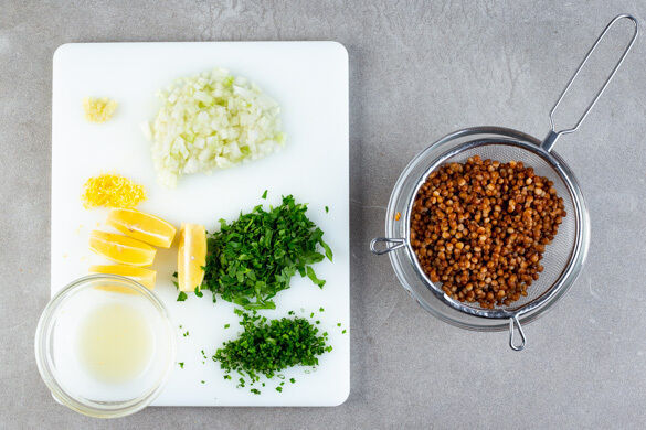Inzwischen die Zwiebeln und den Knoblauch schälen und fein würfeln. Die Petersilie samt Stängeln fein hacken. Den Schnittlauch in kleine Röllchen schneiden. Die Zitronenschale abreiben und die Zitrone halbieren, eine Hälfte auspressen, die andere Hälfte in Spalten schneiden. Die Linsen in einem Sieb abtropfen lassen.